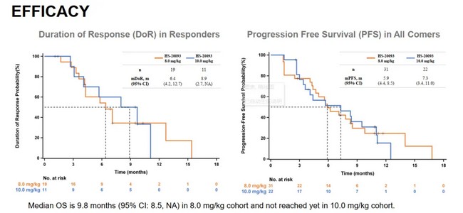 HS-20093在53例肿评患者中,8.0mg/kg剂量组的ORR为61.3%、DCR为80.6%、mDOR为6.4个月、mPFS为5.9个月、mOS为9.8个月但95%置信区间(CI)的上限仍然是“非可达”(NA),这通常意味着数据尚未完全成熟,还有增加的可能性。10.0mg/kg剂量组的ORR为50.0%、DCR为95.5%、mDOR为8.9个月、mPFS为7.3个月(未成熟)、mOS尚未达到。