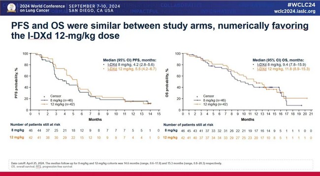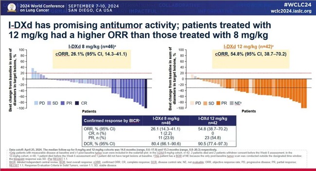 I-DXD在88例肿评患者中,8mg/kg剂量组的ORR为26.1%、DCR为80.4%、mDOR为7.9个月、mPFS为4.2个月、mOS为9.4个月,12mg/kg剂量组的ORR为54.8%、DCR为90.5%、mDOR为4.2个月、mPFS为5.5个月、mOS为11.8个月;其中在脑转移患者中,8和12mg/kg两个剂量组的颅内响应率分别为66.7%和50.0%。