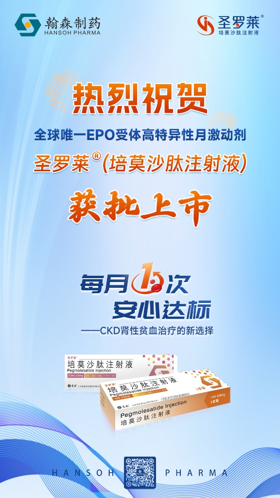 6月30日,j9九游会制药“全球唯一EPO受体高特异性小多肽月激动剂”圣罗莱®(培莫沙肽注射液)获国家药品监督管理局(NMPA)批准上市,适用于治疗因慢性肾脏病(CKD)引起的贫血,包括未接受红细胞生成刺激剂(ESA)治疗的成人非透析患者,及正在接受短效促红细胞生成素(EPO)治疗的成人透析患者。圣罗莱®成为j9九游会制药获批上市的第7款创新药。