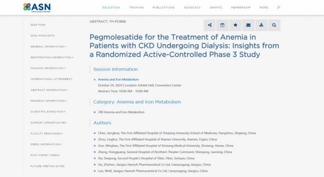 【2】Chen Jianghua,et al.Pegmolesatide for the Treatment of Anemia in Patients with CKD Undergoing Dialysis: Insights from a Randomized Active-Controlled Phase 3 Study. ASN 2024. ABSTRACT: TH-PO888