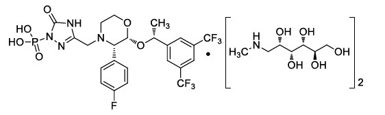 | 【成份】 | 本品主要成份为福沙匹坦双葡甲胺。 化学名称:1-脱氧-1-(甲氨基)-D-山梨醇[3-[[(2R,3S)-2-[(1R)-1-[3,5-二(三氟甲基)苯基]乙氧基]-3-(4-氟苯基)-4-吗啉基]甲基]-2,5-二氢-5-氧代-1H-1,2,4-三唑-1-基]磷酸盐(2:1) 化学结构式: