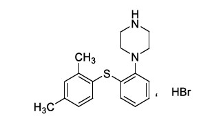 | 【成份】 | 本品主要成份为氢溴酸伏硫西汀。 化学名称:1-[2-(2,4-二甲基-苯硫基)-苯基]-哌嗪,氢溴酸盐 化学结构式:
