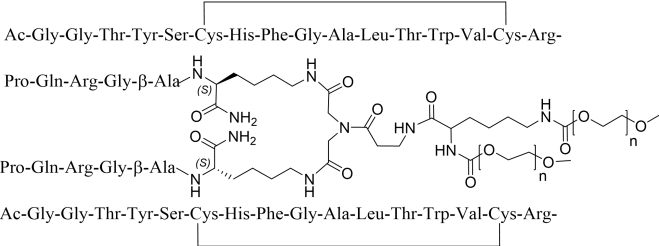 | 【成份】 | 本品活性成份为培莫沙肽。 化学名称:N ε,22 ,Nε,22’-({N α ,N ε-二[ω-甲氧基聚(氧乙烯基)羰基]赖氨酰-β-丙氨酰基}亚胺基 二乙酰基)-二(乙酰基甘氨酰-甘氨酰-苏氨酰-酪氨酰-丝氨酰-半胱氨酰-组氨酰-苯丙氨酰-甘 氨酰-丙氨酰-亮氨酰-苏氨酰-色氨酰-缬氨酰-半胱氨酰-精氨酰-脯氨酰-谷氨酰胺酰-精氨酰- 甘氨酰-β-丙氨酰-赖氨酰胺)环(6-15:6’-15’)-双二硫化物 化学结构式: