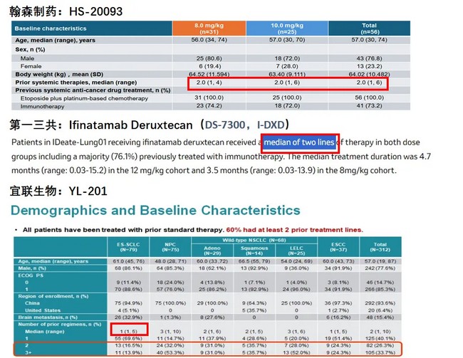 对于小细胞肺癌,三款药物略针对的人群细看之下是不一样的,HS-20093和I-DXD中位治疗为2线,而YL201中位治疗为1线。随着IO在在SCLC的广泛,HS-20093的免疫经治比例是73.2%,Daiichi是76.1%,而YL-201是95%。基线的不同很大程度上代表着病人的基础情况不一样,系统性治疗次数越多,一定程度上病人的生存状况越差。