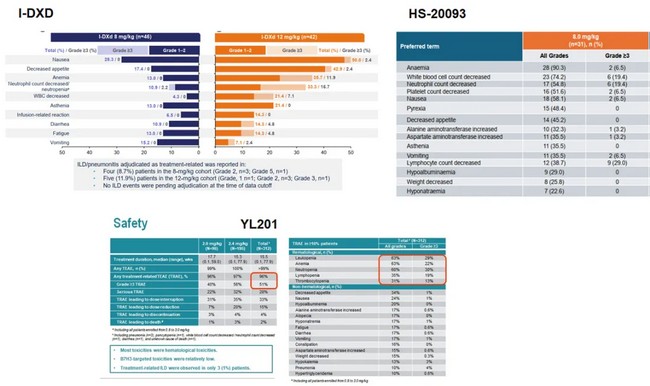 药效方面,单纯看数字,考虑到YL201的患者既往只接受过中位1线治疗,而HS-20093和I-DXD是2线治疗,YL201的ORR略高在预期范围之内,从PFS的数值看,HS-20093和YL-201相当,优于I-DXD,HS-20093的随访时间延长样本量增加,两次新的数据也一直保持同一水平,综合细节性分析HS-20093更占优势。但由于三款药物的入组基线不同,疗效差异比较需要谨慎看待。治疗基线越靠后,病人的生存状况往往越差,也因此HS-20093和I-DXD呈现的数据略显弱势。但可以观察到的是非头对头数据,三者均优于拓扑替康二线治疗数据,都有很大获批的可能性。