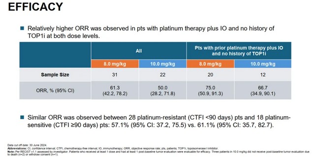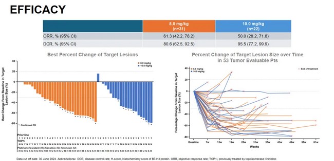 在无TOPi治疗历史的患者中,具有更高的响应率,8.0mg/kg剂量组ORR高达75%,10mg/kg剂量组ORR达66.7%。