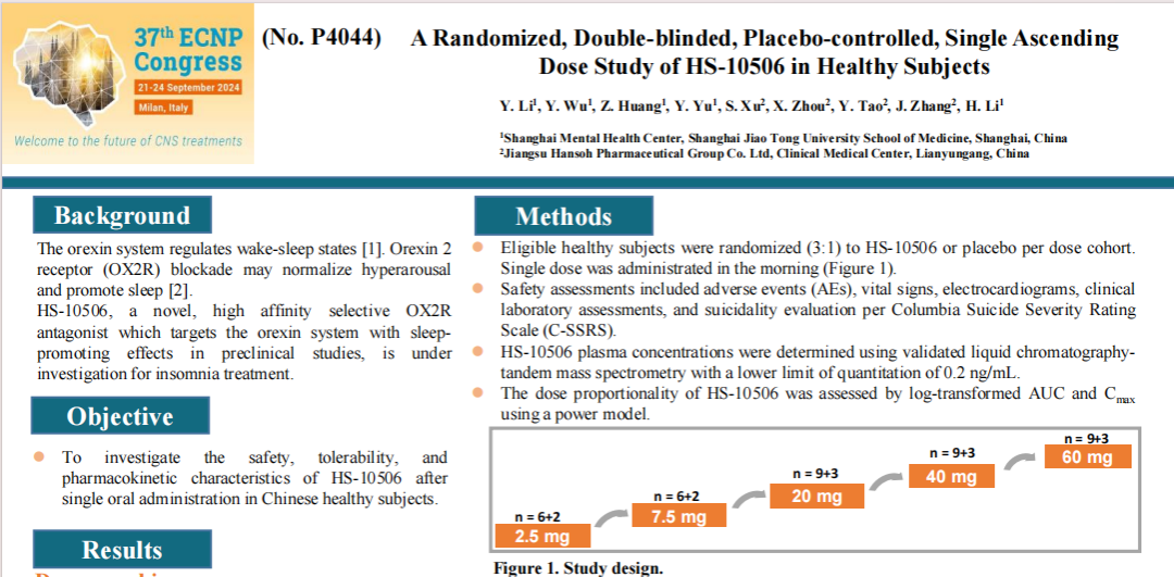 9月21- 24日,第37届欧洲神经精神药理学会(ECNP)大会在意大利米兰举行。j9九游会制药原创1类新药HS-10506【一种新型的高亲和力选择性食欲素2受体(OX2R)拮抗剂】最新研究成果在会上以壁报形式公布,其潜在适应症为失眠症。